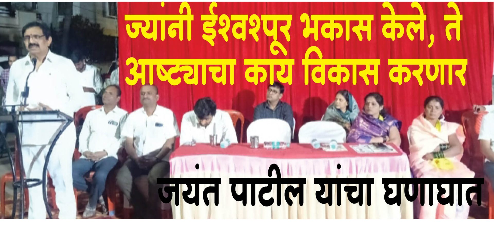 ashta election news : ज्यांनी ईश्वरपूर भकास केले ते आष्ट्याच्या विकास काय करणार? : आ. जयंत पाटील : आष्ट्यात नेते मंडळींना घेऊन येऊन आष्ट्याच्या विकास करणार म्हणणार्यांनी ईश्वरपूरच काय केलं, ज्यांनी ईश्वरपूर भकास केले ते आष्ट्याच्या विकास काय करणार? असा सवाल आ. जयंत पाटील यांनी निशिकांत भोसले पाटील यांचे नाव न घेता केला.