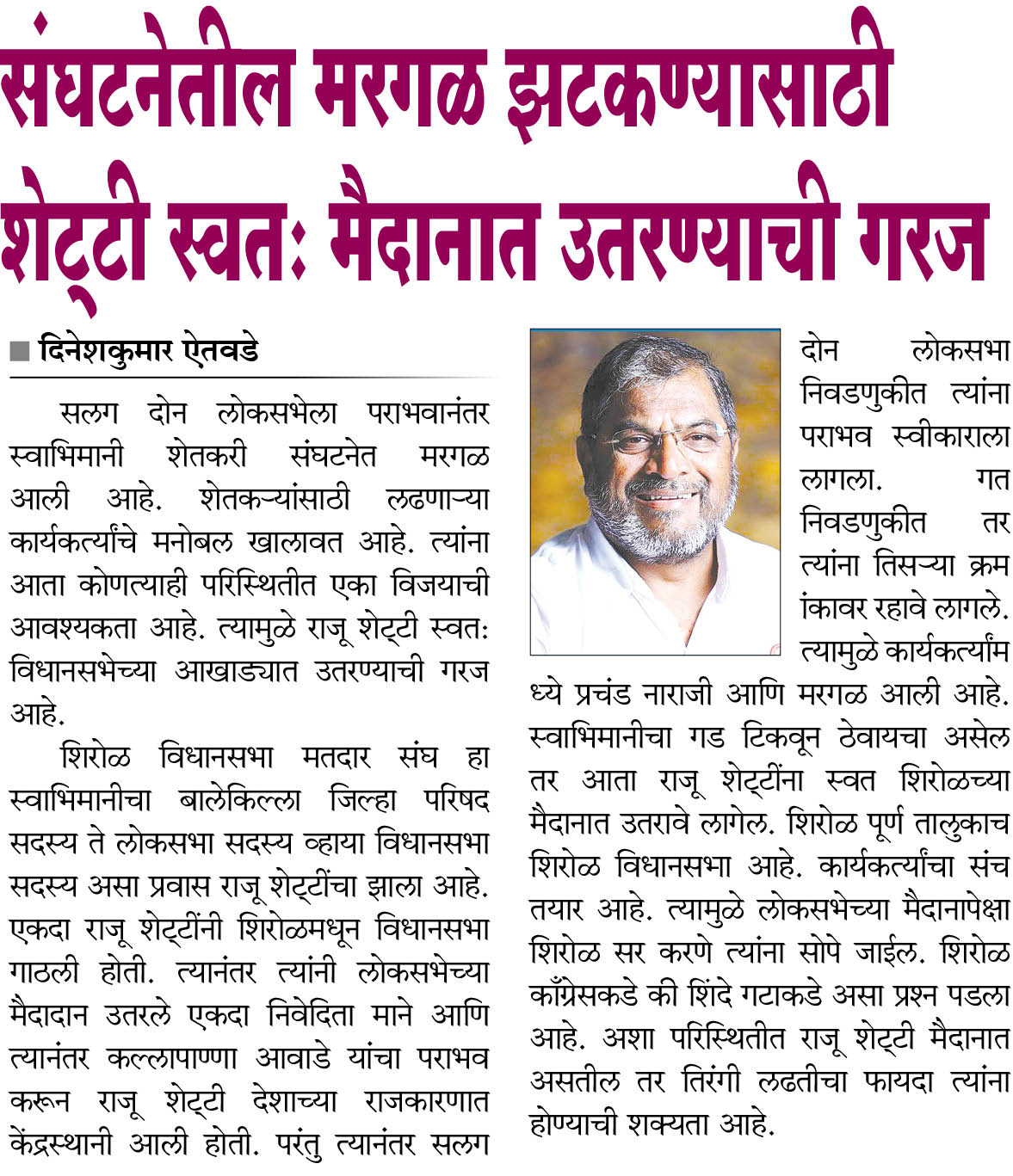 shirol vidhansabha news : उल्हास पाटील यांच्या प्रवेशाने स्वाभिमानीला बळ शेतकरी संघटनेत नवचैतन्य: शेट्टींना प्रयत्नांची पराकाष्टा करावी लागणार October 29, 2024 No Comments